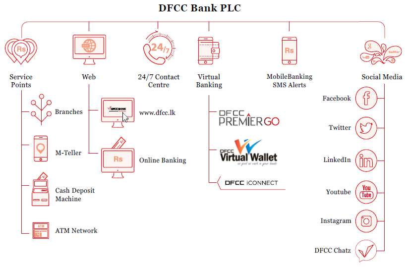 The Bank reaches its customers through an extensive network of touch points ranging from conventional brick and mortar to Internet and mobile centric digital banking solutions that include DFCC Virtual Wallet, Premier Go and DFCC iConnect. Keeping up with ever changing customer aspirations and preferences is a fundamental reason for the Bank using cutting-edge banking technology to reach the customer, and while many customers prefer to bank via conventional means for the human touch, upcoming generations of customers demand a contextual banking experience. In light of this, the Bank will continue to come up with innovative means of expanding its reach.
