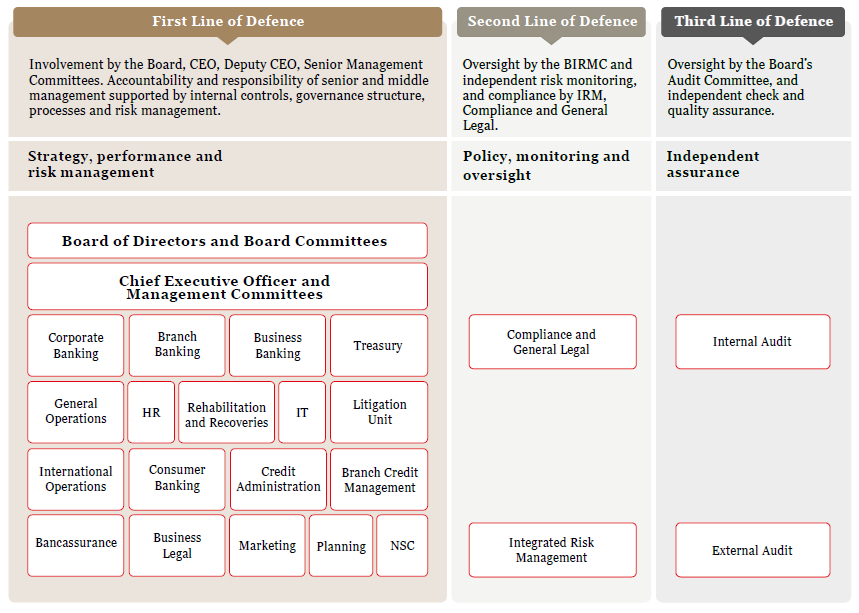 The First Line of Defence involves the supervision and monitoring of risk management practices by the business managers, Corporate Management and executive committees while discharging their responsibilities and accountability for day-to-day management of business operations. Independent risk monitoring, validation, policy review and compliance by the Integrated Risk Management Department (IRMD), the compliance function and periodic monitoring and oversight by the Board Integrated Risk Management Committee (BIRMC) constitute the Second Line of Defence. The Third Line of Defence is provided by the independent check and quality assurance of the internal and external audit functions.
