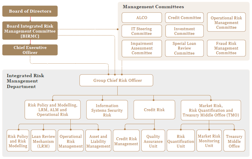 Management Committees such as the Credit Committee (CC), Asset and Liability Management Committee (ALCO), Operational Risk Management Committee (ORMC), Fraud Risk Management Committee (FRMC), Special Loan Review Committee (SLRC), IT Steering Committee (ITSC), Investment Committee (IC), and Impairment Assessment Committee (IAC) are included in the organisational structure for integrated risk management function. The responsibilities and tasks of these Committees are stipulated in the Board-approved Charters and Terms of References (TORs) and the membership of each committee is defined to bring an optimal balance between business and risk management.